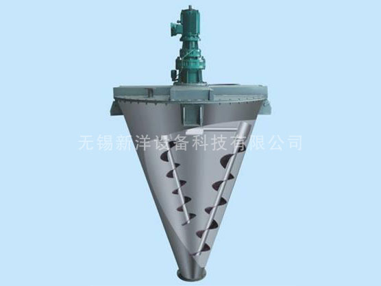 立式混合机,它由传动部分、筒盖、螺旋、筒体、出料阀等组成。