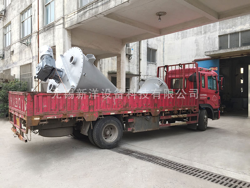 3、螺旋部分:筒体内两只非对称排列的螺旋作自、公转行星运动时,在较大范围翻动物料,使物料快速达到均匀混合。