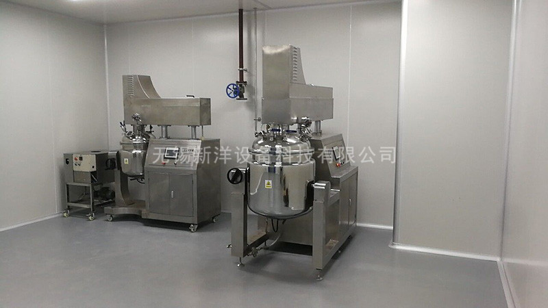 物料在水锅、油锅内通过加热、搅拌进行混合反应后,由真空泵吸入乳化锅,通过乳化锅内上部的中心搅拌、聚四氟乙烯刮板始终迎合搅拌锅形体,扫净挂壁粘料,使被刮取的物料不断产生新界面,再经过叶片的剪断、压缩、折叠,使其搅拌、混合而向下流往锅体下方的均质器处,物料再通过高速旋转的切割轮与固定的切割套之间所产生的强力的剪断、冲击、乱流等过程,物料在剪切缝中被切割,迅速破碎成200um-0.2um的微粒,由于乳化锅内处于真空状态,物料在搅拌过程中产生的气泡被及时抽走。采用抽真空的方式,使所生产的制品在搅拌过程中不再混入气泡,从而保证可制造出富有光泽、细腻及延展性良好的产品。