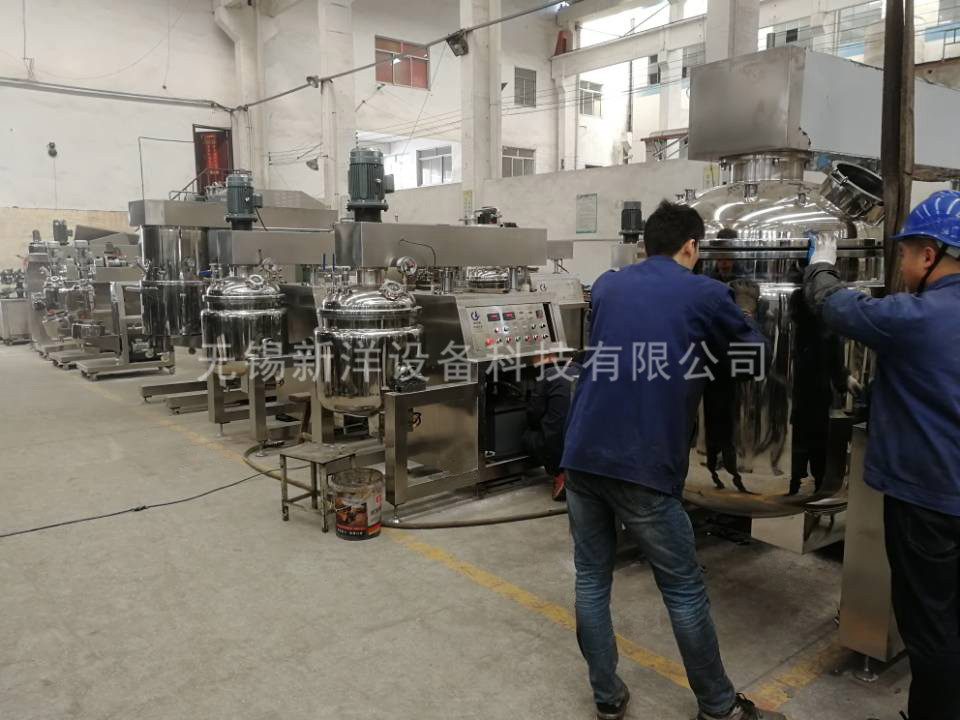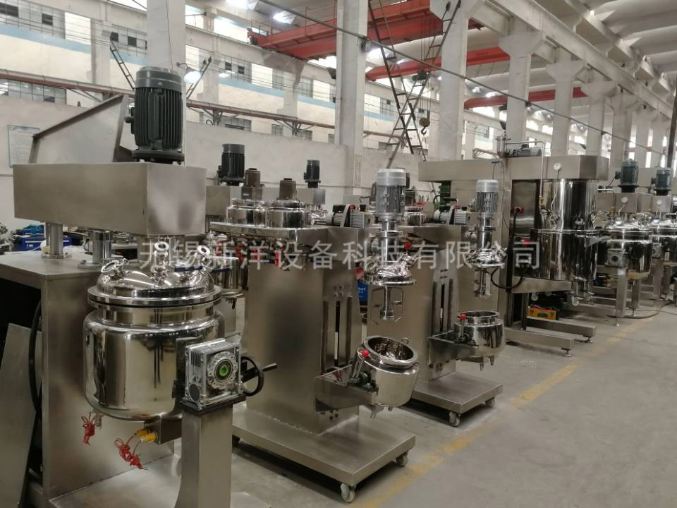 物料在水锅、油锅内通过加热、搅拌进行混合反应后,由真空泵吸入乳化锅,通过乳化锅内上部的中心搅拌、聚四氟乙烯刮板始终迎合搅拌锅形体,扫净挂壁粘料,使被刮取的物料不断产生新界面,再经过叶片的剪断、压缩、折叠,使其搅拌、混合而向下流往锅体下方的均质器处,物料再通过高速旋转的切割轮与固定的切割套之间所产生的强力的剪断、冲击、乱流等过程,物料在剪切缝中被切割,迅速破碎成200um-0.2um的微粒,由于乳化锅内处于真空状态,物料在搅拌过程中产生的气泡被及时抽走。采用抽真空的方式,使所生产的制品在搅拌过程中不再混入气泡,从而保证可制造出富有光泽、细腻及延展性良好的产品。
